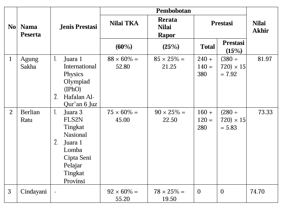 Agung Sakha mempunyai sertifikat Olimpiade Fisika Internasional (IPhO), Sertifikat Hafiz Qur’an dengan hafalan sebanyak 6 juz, rerata nilai rapor semester 1 s.d. 5 sebesar 85, dan nilai hasil tes sebesar 88. Perhitungan nilai akhir yang diperoleh Agung Sakha adalah sebagai berikut :